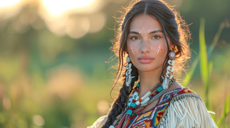 Close up of a young Native American woman showcasing traditional beaded attire and feather adornment, celebrating cultural heritage