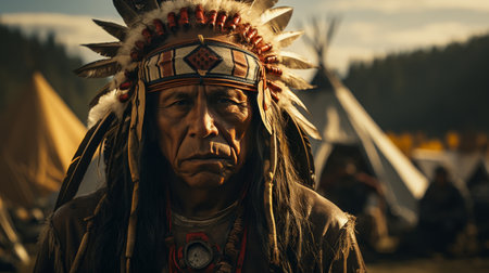 A native American chief wearing a feathered headdress stands before his village, a symbol of heritage and leadership