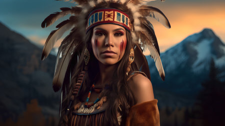 Majestic portrait of a proud indigenous leader set against a breathtaking mountain backdrop, celebrating diverse cultural traditions and natural beauty. Generated A.I.
