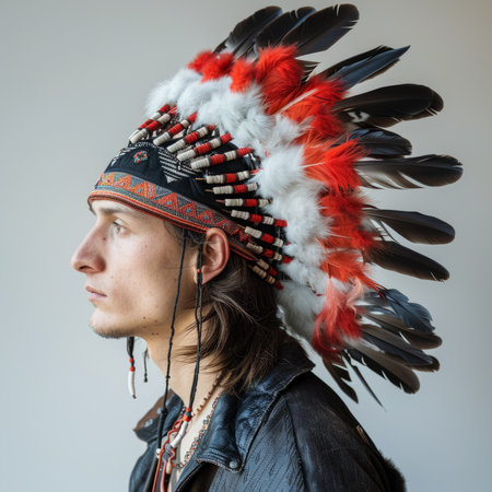Depicting a rich history, a person adorned with a Native American headdress symbolizes cultural honor.