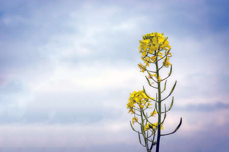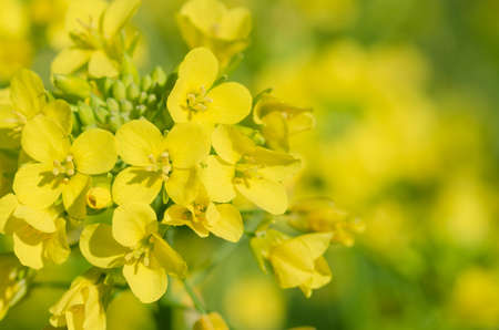 Yellow flowers of turnips with the background out of focus. Copy space.