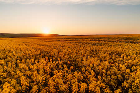 Rapeseed field at sunset. Beautiful nature scene with blooming flowers.