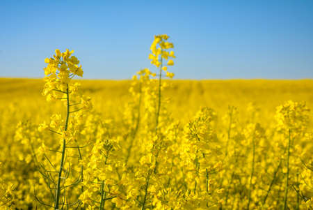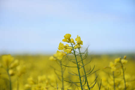 Detail of flowering rapeseed canola or colza field in rural british lands, plants for green energy and oil industry, rape seed flowering landscape with clear blue sky and blurry background
