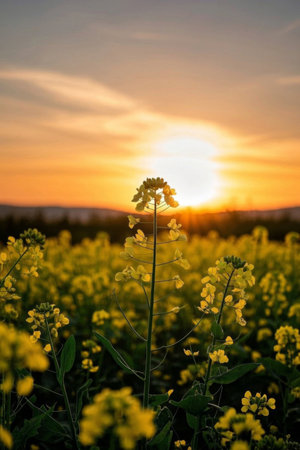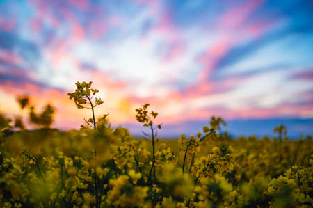 Close up of a yellow rapeseed flower. In the background is a colorful sunset and an entire rapeseed field. Shallow depth of field.