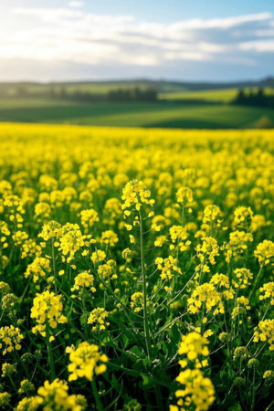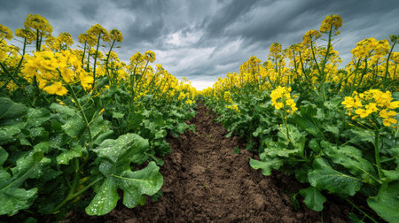 Generative AI : rapeseed yellow flowers against blue stormy sky