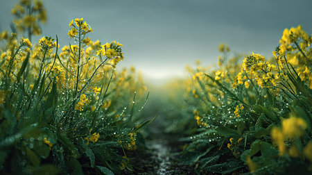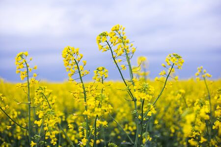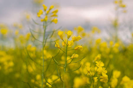 Close-up view of rapeseed flowers field in rainy day with cloudy sky. Natural background.