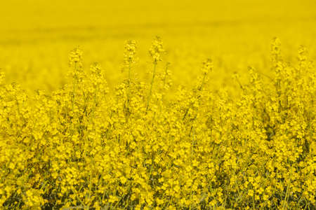 Summer or spring natural floral background with yellow blooming field, blurred image, selective focus