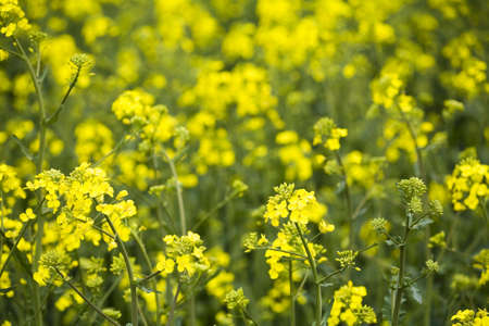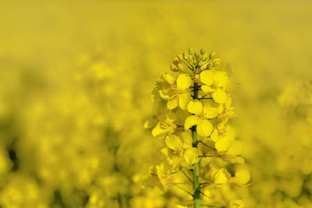 Rapeseed flowers in field of rapeseed with shallow depth of field