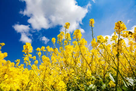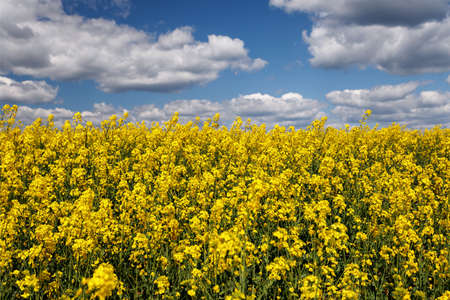 Canola field with canola oilseed and yellow rape flowers. Blue cloudy sky. Spring time