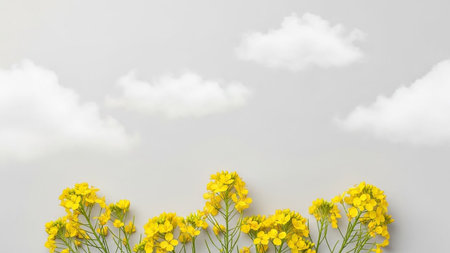 A stunning scene featuring a vast field of bright yellow flowers under a clear blue sky adorned with fluffy white clouds, creating a serene landscape.
