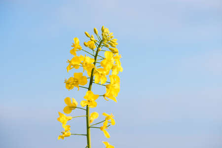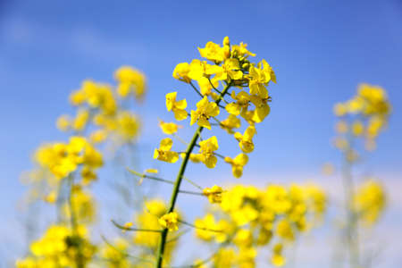 Blooming yellow canola rapeseed plant on field at spring over blue sky