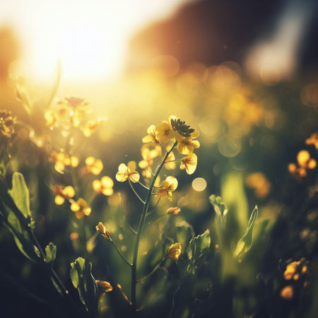 Blooming rapeseed field at sunset. Warm tones, lens flare