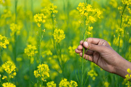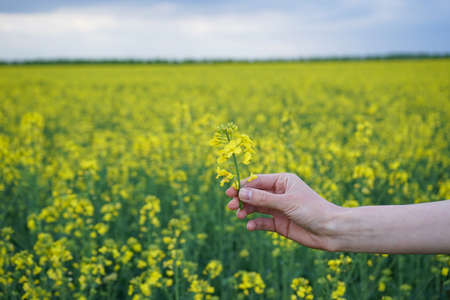 Female farmer hand touching blooming rapeseed crops in field, close up with selective focus