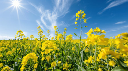 A stunning view of a field filled with vibrant yellow flowers under a clear blue sky, accentuated by wispy clouds and bright sunlight. A perfect nature scene.