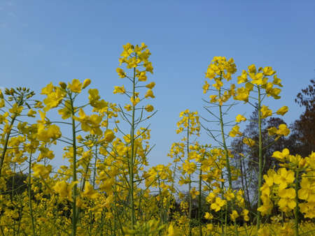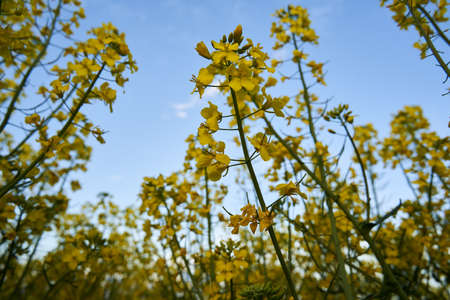 Yellow rapeseed flowers in a field against a blue sky. yellow rapeseed flowers, rape, colza, rapaseed, oilseed, canola, closeup against s sunny blue sky