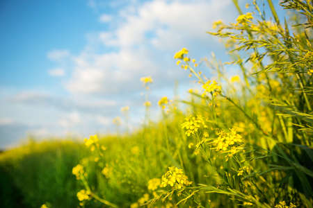 sky against the background of which photographed close-up flowering rape. In the daytime sky there is a shining sun