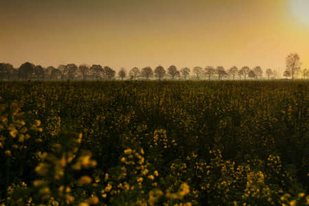 Yellow rapeseed field at the sunset. Sunlight illuminates yellow canola. Agricultural field. Rural landscape