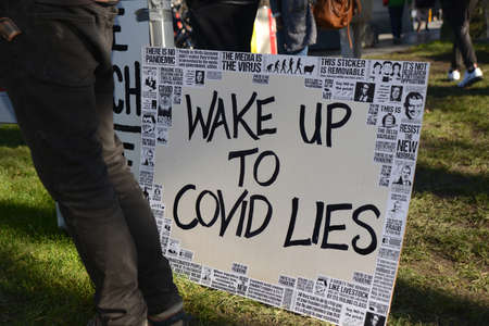 CHRISTCHURCH, NEW ZEALAND, JULY 24, 2021; Detail of a placard at a protest rally at the Bridge of Remembrance in Christchurch. Activists spoke against increasing government control over Covid vaccinations, farm taxes and civil liberties.