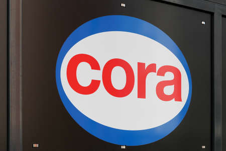 Voiron, France - October 22, 2018: Cora sign on a facade. Cora is a retail group of hypermarkets located in France and Europe. Cora was founded in 1974 by the supermarket holding Louis Delhaize Group
