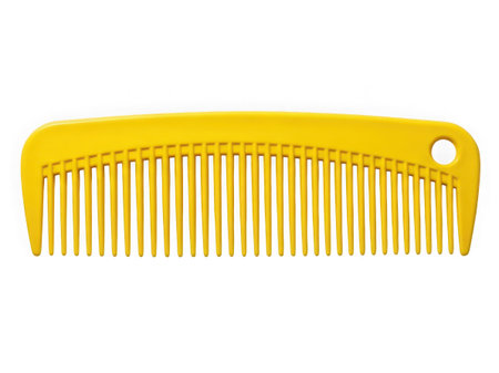 Single yellow plastic comb with wide teeth isolated on white background