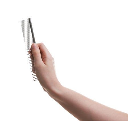 Woman with comb for pet grooming on white background, closeup