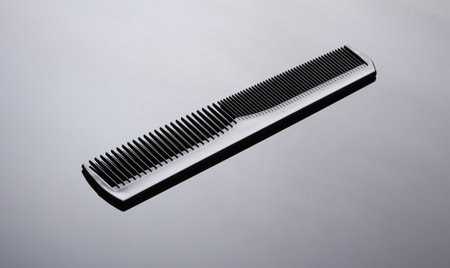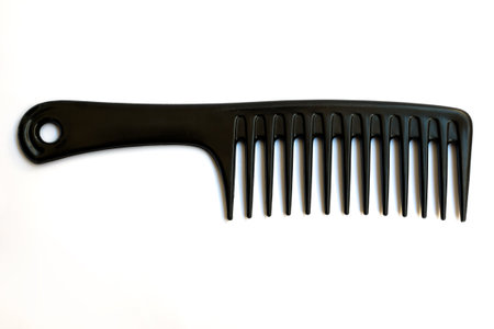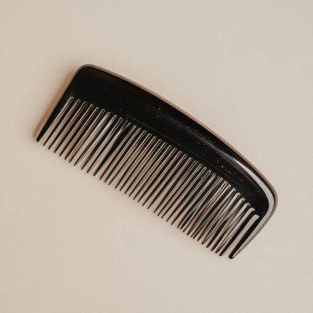 A black plastic hair comb is placed neatly on a smooth beige surface under natural light, creating a clean and minimal look.