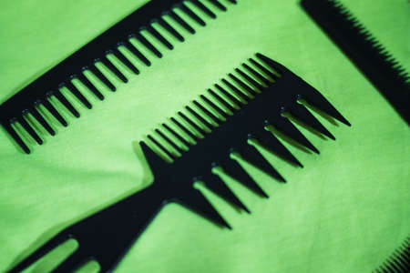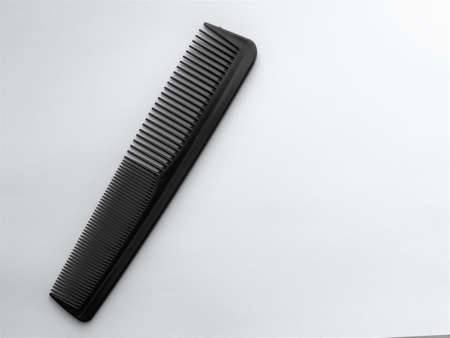black plastic comb with frequent and sparse teeth, barber tool isolate on white background, dark household personal hygiene object on light surface