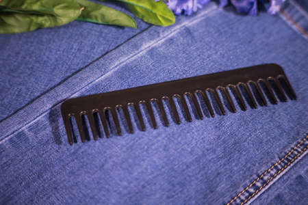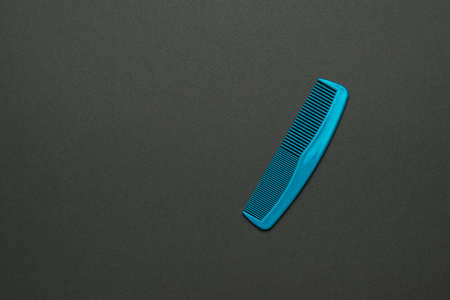 Classic blue plastic comb on a black background. A tool for hair care. Flat lay.