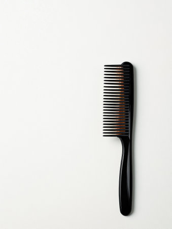 This close up shows a black comb with a few strands of hair resting on a blank surface, perfect for discussing personal grooming.