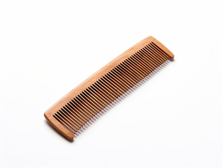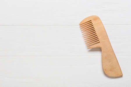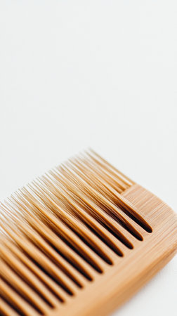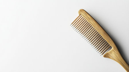 Detailed view of a wooden comb resting on a light surface with a few strands of hair, leaving space for writing or design elements.