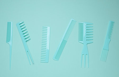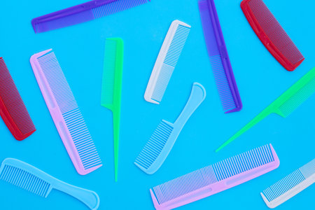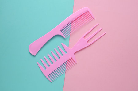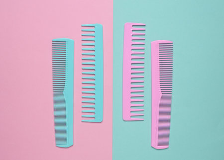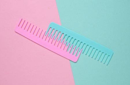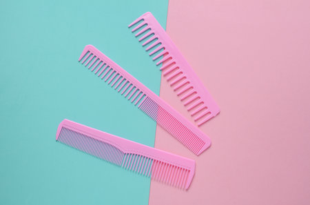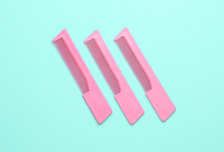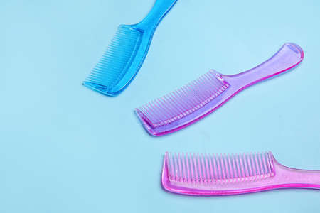 Pink plastic combs on a blue background. Beauty and fashion minimalism still life