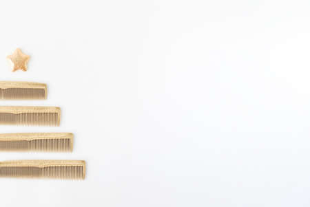 Christmas tree made of combs on a white background. New years banner for hair salon with space for text. Template for a Barber greeting card. Holiday picture with gold accessories.