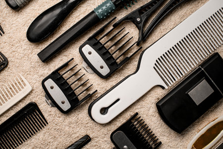 Various equipment for hairdressing service on table. Top view. Barbershop.
