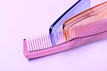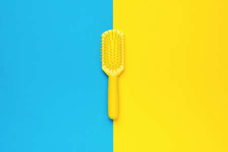 Hairstyle concept with hair brush on yellow background. Fashion, beauty and hygiene. Plastic comb for salon and home usage
