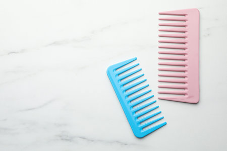 Set of hair combs on pink background. Professional decorating tools, beauty blogger concept, top view