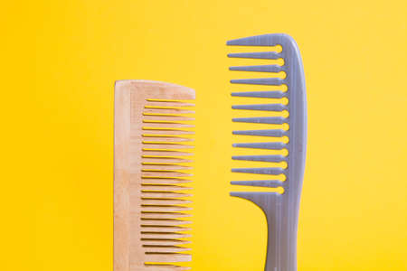 plastic and wooden combs on a yellow background, protecting the environment from pollution plastic concept, zero waste lifestyle, focus on a wooden comb