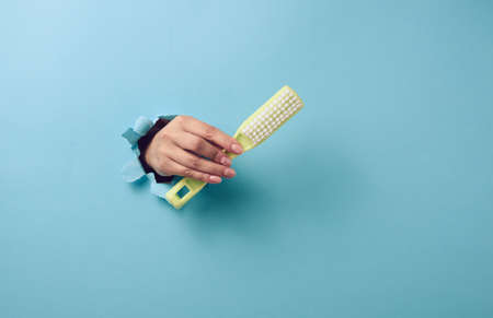 female hand holds a green plastic brush on a blue background. A part of the body sticks out of a hole with torn edges in a paper background