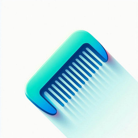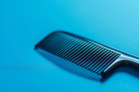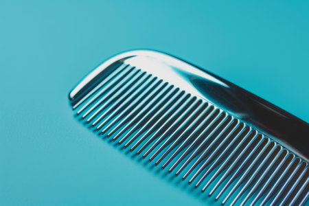 A shiny, metallic comb rests on a bright turquoise backdrop, showing its smooth surface and finely spaced teeth. The reflection creates a captivating play of light and color.
