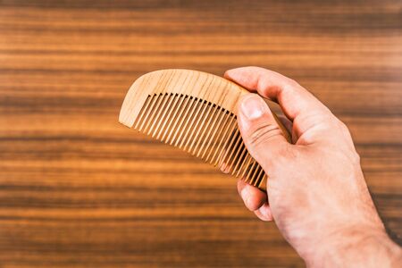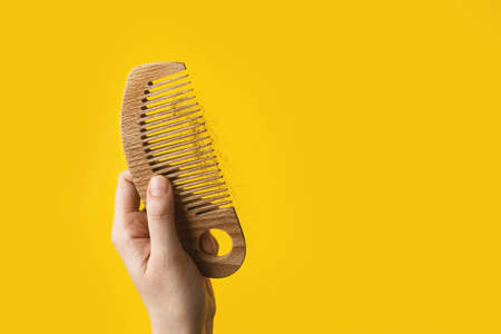 A hand holding natural wooden comb for scalp massage and aroma combing. Hair care concept.