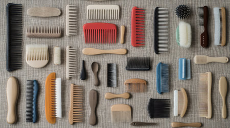 This image showcases a diverse collection of hair combs and brushes arranged neatly on a neutral background, perfect for beauty themes and grooming topics.