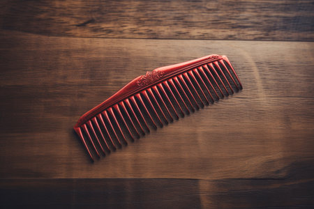 Captivating Contrasts: The Vibrant Red Hair Comb Stands Out on the Earthy Brown Wooden Table