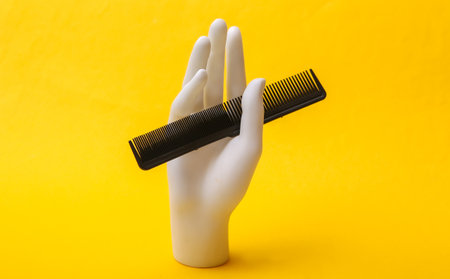 Mannequin hand holding comb on yellow background. minimalist beauty concept