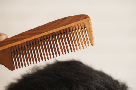 Detailed look at a wooden comb with hair strands resting on it, perfect for displays in salons or personal grooming spaces.