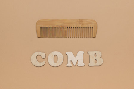 Lettering comb and classic wooden comb on beige background. A hair care accessory.