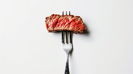 Fork with beef steak medium rare, white clean background. Aesthetic restaurant concept. Generative AI.