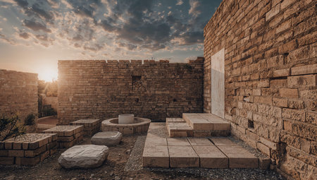 Sunset light casts shadows over the stone walls of the old ruins. The area has steps and stones arranged on the ground. Grass grows nearby as the sky fills with clouds.