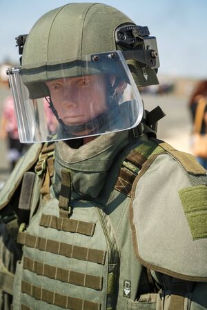 Mannequin in an army helmet and bulletproof vest