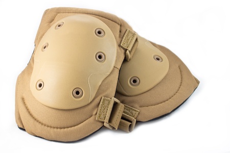 The legs of a strong man dressed in camouflage pants with knee pads.