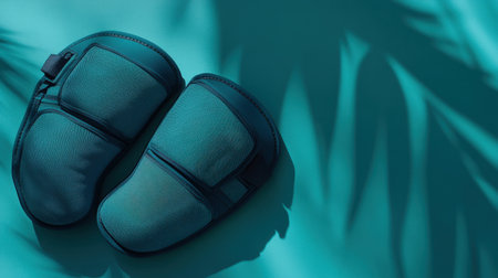 A stylish and modern pair of footwear displayed on a soft turquoise surface, enhanced by tropical shadow patterns that evoke comfort and leisure.