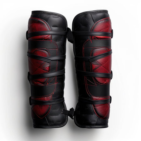 Durable and stylish black and red shin guards designed for martial arts enthusiasts. Adjustable straps ensure a secure fit for optimal protection during training and competitions.